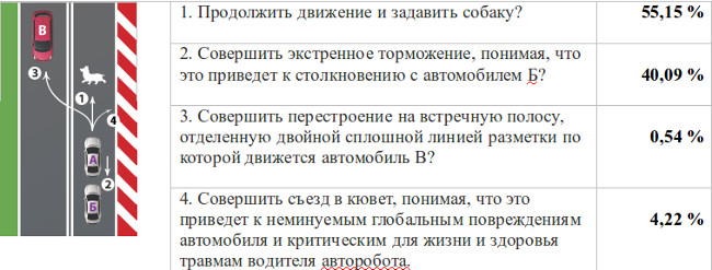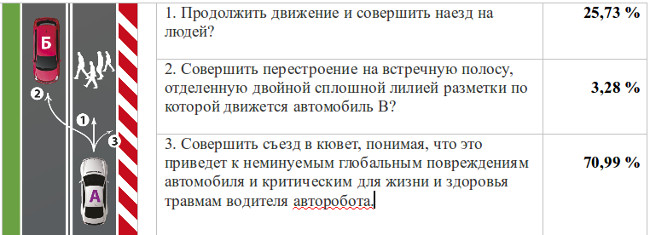 Однако, проведенные в рамках исследования дополнительные, персональные интервью с разными категориями граждан России, показали, что направляя беспилотный автомобиль в кювет, участники исследования не до конца отдавали себе отчет, что они сами могут оказаться в его кабине. Получается, чтобы сохранить жизнь выбежавших на дорогу людей, авторобот будет запрограммирован на самоуничтожение вместе со своим пассажиром.