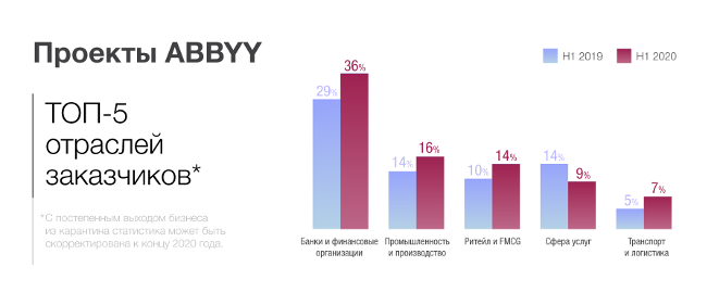 ABBYY Россия проанализировала новые крупные проекты для корпоративных заказчиков, реализованные в первом полугодии 2020 года. Больше всего технологии ABBYY используют банки (36%), промышленность (16%) и ритейл (14%).