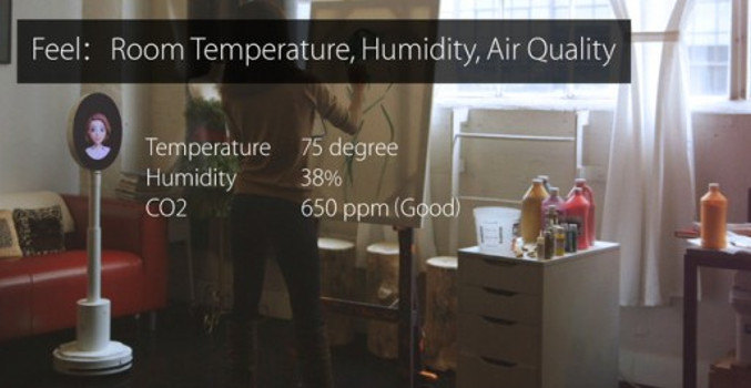 Одной из особенностей этого робота является акцент на домашнюю автоматизацию. Массив датчиков робота включает 3D камеры, датчики температуры, влажности, освещенности и давления, а также содержания CO2. Установленный на колесной базе с сервоприводами, робот свободно перемещается по дому, так что, в то время, когда вы находитесь далеко, он может отправить вам сообщения и даже видео из любой комнаты дома.