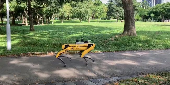 Новый четырехногий робот, который был выпущен в парке Бишан-Анг Мо Кио, передает сообщение, напоминающее посетителям о необходимости держаться подальше от других людей, так как covid-19 представляет очень серьезную угрозу здоровью. Робот поступил в продажу бизнесу и правительству в прошлом году и оснащен камерами для того, чтобы обходить препятствия.