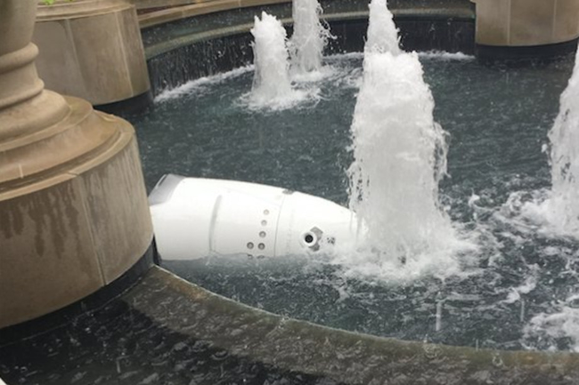 Ранее в этом году был арестован пьяный человек за то, что он сбил K5. Хотя стоит отметить, что робот не всегда был жертвой, после того, как он споткнулся о малыша и спокойно уехал прошлым летом. K5 был создан для использования в качестве робота для патрулирования. Его ракетообразная форма и «безрукий» дизайн делают невозможным самостоятельный подъем, но сегодняшнее падение прямо в фонтан кажется по-настоящему актом свободной воли.