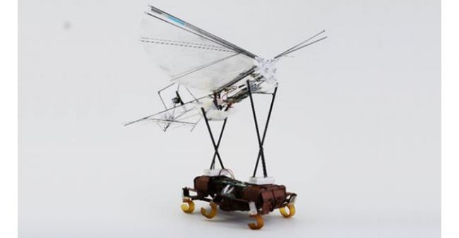 Речь идет о роботе VelociRoACH, созданном в Калифорнийском университете в Беркли. Это устройство, разгоняясь, позволяет взлететь летающему мини-роботу H2Bird, запуская его со своей рамы. H2Bird весит чуть более 13 грамм, а время полета робота составляет полторы минуты. Робот не может оторваться от земли самостоятельно, для взлета ему требуется развить скорость около 1,3 м/с под углом 35-40 градусов – именно такие условия обеспечивает рама VelociRoACH.