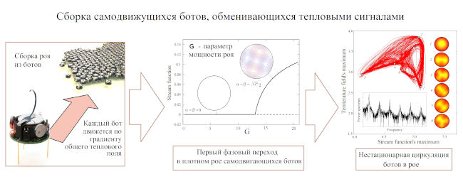 "Мы рассмотрели свойства сформировавшегося роя из мелких роботов в заданных границах. Результаты анализа математической модели показали, что с увеличением их количества в рое проявляется самоорганизация. Выяснилось, что аналоги тепловой конвекции возникают в различных активных средах, когда элементы системы имеют внутренние источники энергии и способны двигаться за их счет. В эту категорию попадают как стайные живые организмы, так и коллективы из роботов с вибромоторами", – рассказывает доктор физико-математических наук, заведующий кафедрой прикладной физики ПНИПУ Дмитрий Брацун.