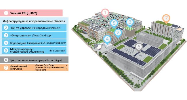 - Центр управления городом, Студия инноваций, Студия обмена идеями и т.д. (корпорация Panasonic) - Международный студенческий кампус (Университет Кейо) Городской Энергоцентр (Tokyo Gas Group) Водородная зарядная станция (JXTG Nippon Oil & Energy Corporation) Умный торгово-развлекательный центр (Apita-Terrace Yokohama Tsunashima by UNY) Центр разработки смарт-технологий YTC (Apple) «Умный» многоквартирный жилой комплекс (Nomura Real Estate Development, Kanden Realty & Development and PanaHome) |