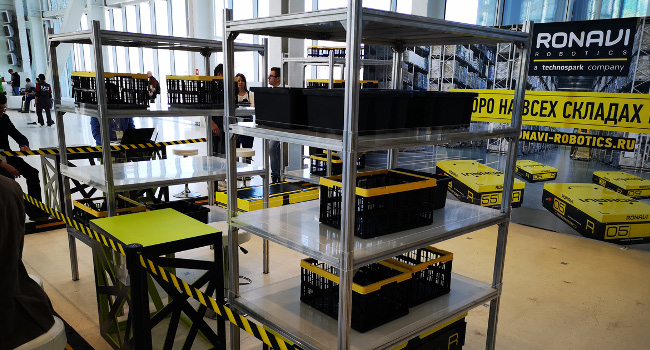 Иван Бородин: Робот Ronavi трудится на участке комплектации, он сокращает время доставки товара с момента заказа в интернет-магазине. В устаревающей системе склада стеллажи стоят стационарно, а комплектовщики перемещаются между ними в произвольном порядке, чтобы найти нужный товар. После того, как мы внедряем роботов, комплектовщик уже стоит на одном месте, а стеллажи могут перемещаться с помощью мобильных роботов, управляемых искусственным интеллектом. Время теперь легко спрогнозировать. Система управления заказами с помощью роботов привозит нужные стеллажи в нужную точку к комплектовщику в нужной последовательности. Таким образом увеличивается скорость комплектации заказов до 10 раз и плотность хранения товаров на складе до двух раз.