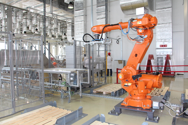 Автоматизированы и все основные операции на участке сборки фотоэлектрического модуля. Сортировка и упаковка готовых солнечных модулей также роботизирована. Робот-упаковщик ABB считывает этикетку и укладывает готовые солнечные модули в паллеты в соответствии с установленной мощностью.