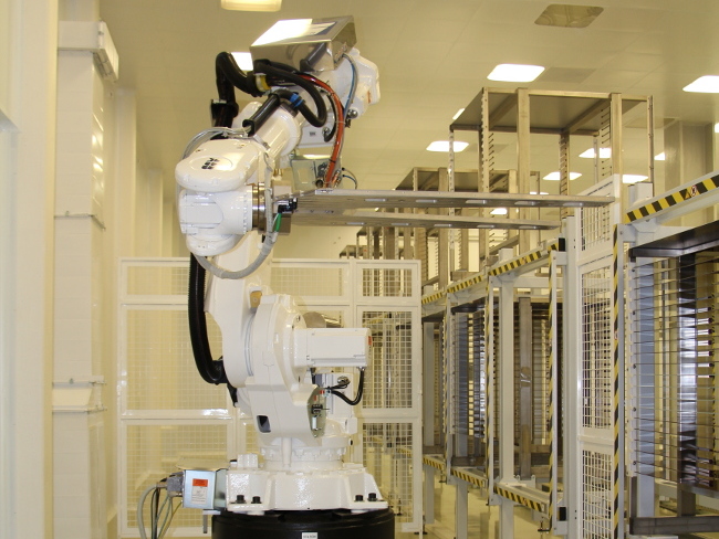 После модернизации в качестве исходного материала на производстве вместо стекла используются пластины кристаллического кремния. Они размещаются на специальных подложках и транспортируются в автоматизированную линию, роботы ABB загружают подложки в реакторы для осаждения нанослоев аморфного гидрогенизированного кремния и выгружают после завершения операции.