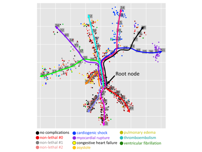 На рисунке - Десять клинических траекторий, выделенных из набора данных по осложнениям инфаркта миокарда, собранных Красноярским государственным медицинским университетом (Россия). Каждая точка представляет собой наблюдение пациента с диагнозом инфаркт миокарда, цвет обозначает возможные осложнения этого заболевания.