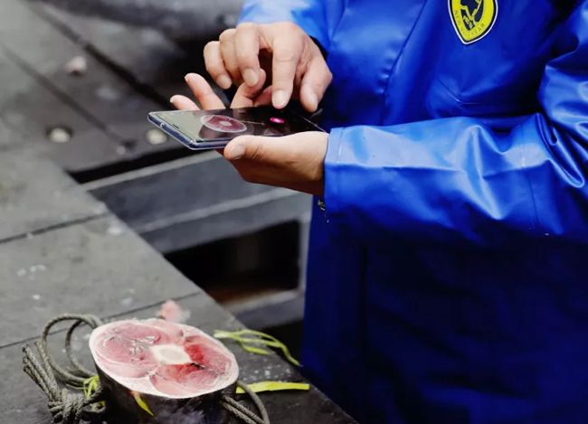 В нем используется алгоритм, который был натренирован с помощью машинного обучения на базе тысяч изображений разрезов тунцов, т.к. хвостовой отрез рыбы может многое рассказать покупателю о ее качестве.