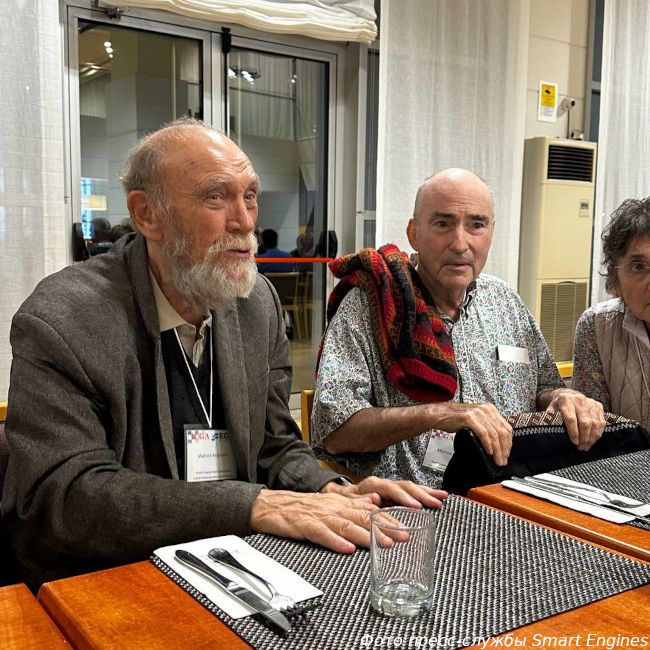 На фото первый слева - Владимир Львович Арлазаров, член-корреспондент РАН, создатель программы-победителя первого чемпионата мира среди шахматных программ, директор по науке Smart Engines. Справа - Монти Ньюборн, бывший президент Международной ассоциации компьютерных шахмат и соавтор шахматной программы Ostrich.