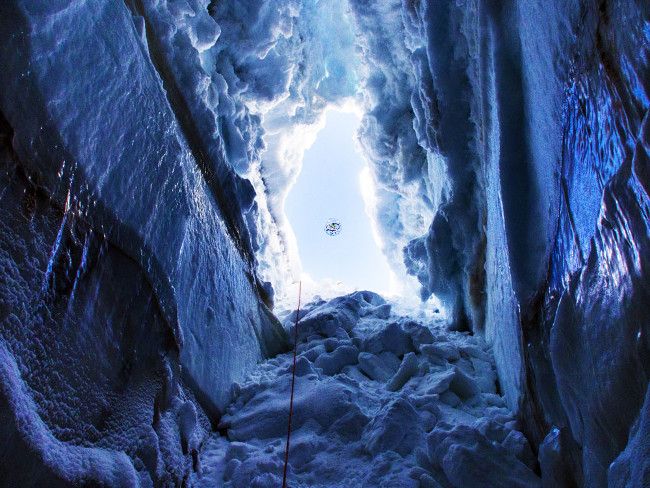 До сих пор расщелины в леднике были, как правило, недоступными (как для людей, так и для роботизированной технологии), потому что чрезвычайно трудно перемещаться по их узким проемам с осыпающейся поверхностью. Однако дрон Flyability имеет в этом случае преимущество, используя сферический, свободно вращающийся защитный каркас, называемый карданным подвесом. Он способен без проблем протиснуться в расщелину и подняться наверх, снимая захватывающее видео ландшафта вдоль своего пути. Встроенная камера Full HD, система передачи цифрового видео и мощная система освещения позволили дрону работать в самом сердце горного ледника, в десятках метров ниже поверхности.