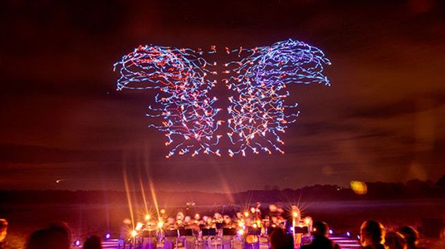 Управляемая с земли операторами с помощью компьютеров с программным обеспечением Intel масса дронов подсвечивала ночное небо синхронно с исполняемой оркестром музыкантов пятой симфонией Бетховена. Потрясающее световое шоу напоминало фейерверк.