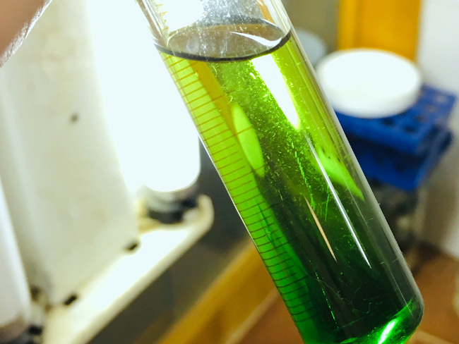 Мензурка с раствором, содержащим измельченные части листьев березы. В дальнейшем будет использована для спектрометрических измерений содержания хлорофилла в образцах. Изучение воздействие металлургического комбината «Североникель» на растительные системы региона.