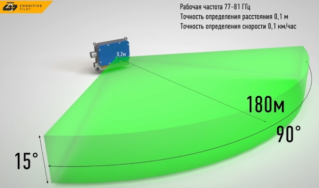Cognitive Imagine Radar способен детектировать объекты на расстоянии до 180 - 200 м в диапазоне углов азимута более 90˚ - 100˚ и угла места до 15˚ - 20˚ (достижение больших размеров угла не целесообразно для практических задач). Его рабочая частота находится в диапазоне от 76 до 81 ГГц.