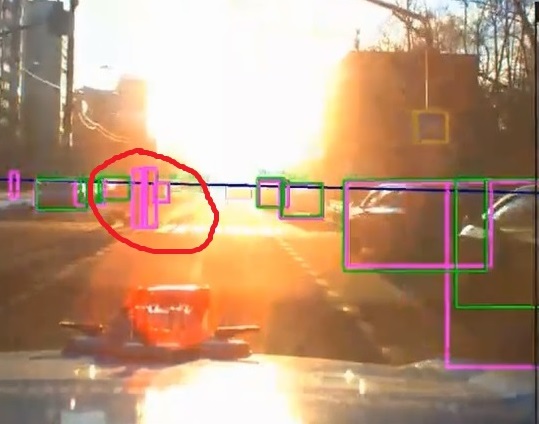 Cognitive Imaging Radar оказывает существенную помощь при анализе сложных и пограничных ситуаций: при ослеплении светом, переходе из света в тень и наоборот и т.д. На изображении даже человеку сложно увидеть переходящую через дорогу женщину с коляской, но ее детектирует Cognitive Imaging Radar