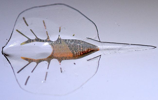 Вдохновленные сравнительно простой формой и методами плавания таких морских обитателей, как скаты и морские коньки, специализирующиеся на микроэлектронике и фотонике специалисты под руководством Сун-Джин Пак из Университета штата Иллинойс впервые сделали основу для робота-рыбы из золота. Скелет из золота размером примерно в 1/10 от габаритов нормального ската был разработан таким образом, что он может накапливать энергию, когда изогнут вверх.
