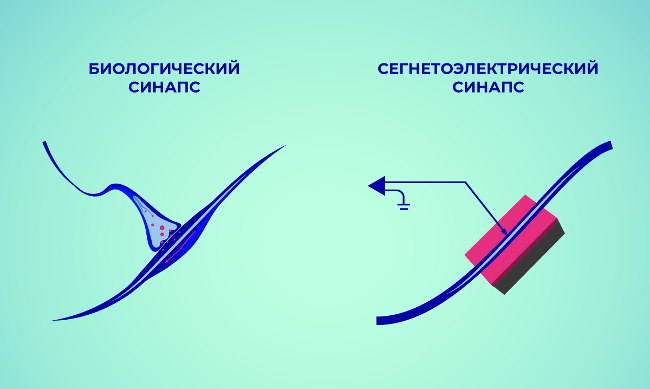 Рисунок 1. Слева изображен синапс из живого мозга — прообраз искусственного синапса (справа). Последний представляет собой мемристор, реализованный в виде туннельного сегнетоэлектрического перехода — тонкой пленки оксида гафния (розовый), проложенной между электродом из нитрида титана (синий) и кремния (серый). Кремниевый электрод одновременно играет роль подложки. Внешние электрические импульсы переключают состояния мемристора за счет изменения поляризации оксида гафния и, следовательно, его проводимости.