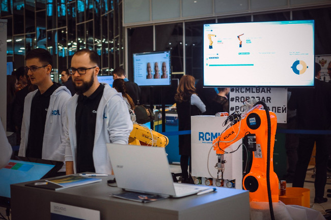 Мы демонстрировали работу RCML на стенде, изготовленном специально под Skolkovo Robotics 2017 - стенд представлял собой робо-бар, где два промышленных робота под управлением RCML осуществляли функции вендингового автомата. Робо-бар работал за лайки и репосты в соц.сетях.