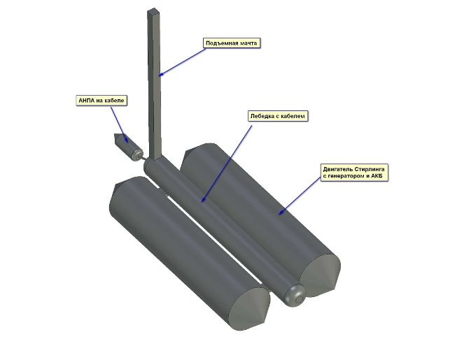 Кратко суть концепции АНПА «Балаба» можно изложить как: полупогружное судно катамаранного типа (Рис.1) с возможностью подводного планирования, оснащенного электроприводом от аккумуляторных батарей (АКБ) и двигателя Стирлинга на солнечной энергии. Имеется подъемная мачта-антенна с панорамным видоискателем и необходимый набор навигационной аппаратуры. В качестве поисковых средств используются как гидролокаторы бокового обзора на корпусах «Балабы», так и гидроакустические датчики и видеокамера на кабельном АНПА, мотор-лебедка которого закреплена между корпусами «Балабы». Аккумуляторные батареи и основной электронный блок (два — для дублирования) расположены в герметичных контейнерах внутри трубчатых корпусов «Балабы» - они же емкости охлаждения для малотоксичного (умеренно опасного по ГОСТ 12.1.007-76) рабочего тела двигателя Стирлинга. Наружная поверхность «Балабы» в момент подзарядки АКБ возвышается над уровнем моря на 0,1…0,15м. Мачта поднимается при необходимости сеансов связи и ведения наблюдения.