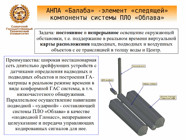 Для этого «Балаба» будет оснащена низкочастотными ГА приборами, а АНПА на кабеле опускаться ниже зонального скачка звука для улучшения фильтрации принимаемых сигналов. Связь нескольких «Балаб» в одном районе дежурства (15-20км) через антенны и обмен данными позволит создать распределенную конформную ГА-антенну для более точного определения координат целей.