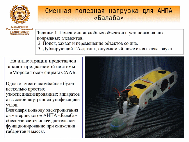 Дополнительный АНПА на кабеле с ситуативным оборудованием позволяет «Балабе» решать целый комплекс задач с минимальной модификацией, что положительно сказывается на унификации устройств, массовости их производства, а в целом — сокращении затрат на поддержание обороноспособности страны.