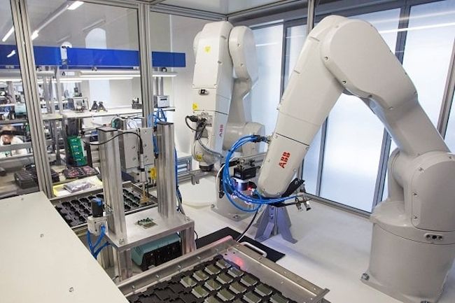 Как отметил генеральный директор «ДС-Роботикс» Михаил Зотов, решение базируется на двух роботах модели ABB IRB 1200, объединенных разработчиком в компактный производственный комплекс. Система самостоятельно извлекает нужные компоненты из обменной тары и помещает на мобильную платформу, которая доставляет заготовку в зону работы руки-манипулятора для осуществления производственной операции (сварки, пайки и т. п.). Технология оптического зрения позволяет роботу точно позиционировать компоненты относительно друг-друга. Далее, в зависимости от конфигурации системы, робот может автоматически передавать изделие на следующий этап производственного процесса, а если он не встроен в линию — складывать его в обменную тару. Закладка-выгрузка готовой сборки из этой тары остаются единственными операциями, требующими участия человека.