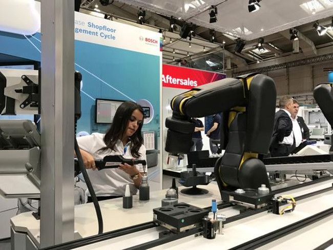 Крупнейший производитель автозапчастей, компания Bosh показала гибридный сборочный конвейер, где совместно работают люди и роботы. Это помогает решать проблему нехватки рабочей силы в таких странах, как Германия и Япония, объяснил представитель Bosch Стефан Ассманн.