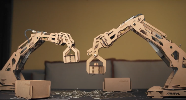 Детище компании – это конструктор ArmPal, состоящий главным образом из деревянных деталей, вырезанных лазером. В процессе сборки манипулятора используются шестерни, гидравлика, шкивы, магниты и отвертка. Как говорят в Mongda, он достаточно прост для детей в возрасте от 10 лет, хотя, конечно, им потребуется некоторая помощь родителей.