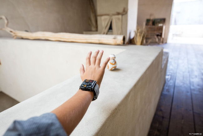 Толкая руку вперед можно заставить ВВ-8 перемещаться вперед, имитация движения руля вызывает поворот влево или вправо, а если потянуть руку назад, то робот вернется в исходную позицию. Вы также можете поднимать и опускать руку, чтобы усккорить или замедлить перемещение робота. Force Band имеет собственное приложение и мини игры.