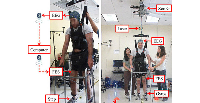 Парализованный в течение пяти лет человек стал субъектом исследования для ученых Калифорнийского университета из Ирвайна. Работа началась с «умственной» подготовки пациента, разработанной для того, чтобы восстановить способность мозга управлять ходьбой, при этом использовался применяемый для снятия электроэнцефалограмм шлем с датчиками для отслеживания импульсов головного мозга. Человек впервые управлял видеообразом в виртуальной среде, после чего последовала физическая подготовка, чтобы нарастить силу мышц ног.