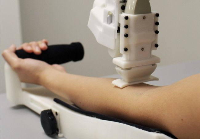 Размещенный над рукой пациента робот использует ультразвуковую систему, чтобы обнаружить подходящую вену. Найдя цель, устройство вводит в вену иглу и берет образец крови – его сразу можно поместить в центрифугу для анализа.