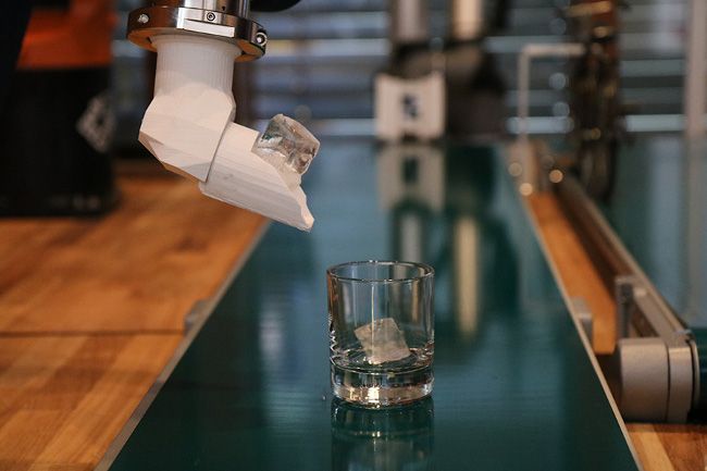 Второй робот - Schunk LWA 4P - заполняет кубиками льда установленный на конвейерную ленту бокал. Это сложно, поскольку кубики льда тают, слипаются через некоторое время и меняют свою форму. Здесь также помогает специально разработанный захват — он гарантированно опускает нужное количество кубиков льда в каждый бокал.