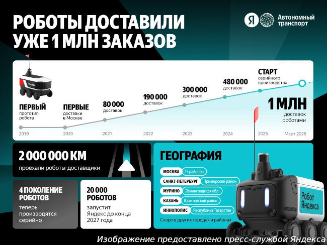 В Нижнем Новгороде, Казани и Подмосковье будут работать роботы-доставщики новейшего, четвёртого поколения. Яндекс представил его осенью 2025 года. Это первые роботы компании, выпускаемые серийно. По возможностям они превосходят своих предшественников — к примеру, у них более высокая проходимость и улучшенный лидар. При этом они проще в производстве и обходятся дешевле. До конца 2027 года Яндекс выпустит 20 тыс. роботов-доставщиков четвёртого поколения. Они будут использоваться во всех новых локациях и постепенно заменять роботов предыдущего поколения в местах, где рободоставка есть уже давно.