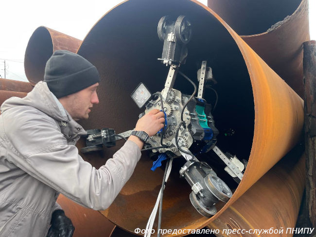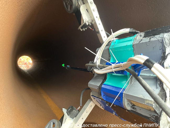 — Главное преимущество — возможность адаптироваться к разным диаметрам от 500 до 1400 мм. Конструкция при этом не меняется, а робот способен перемещаться по вертикальным секциям, — отметил Дмитрий Кучев, старший преподаватель кафедры «Оборудование и автоматизация химических производств» ПНИПУ, кандидат технических наук. Устойчивость и надежность движения робота обеспечивает интеллектуальная система из шести опорных ног с пружинными подвесками. Эта конструкция позволяет всем двенадцати ведущим колесам постоянно сохранять контакт со стенкой трубы, даже на неровностях и крутых поворотах. Компьютерное моделирование и успешные испытания, проведенные в конце октября в Пермском Политехе, подтвердили, что комплекс легко преодолевает 90-градусные отводы и уверенно движется в трубах сложной пространственной конфигурации.