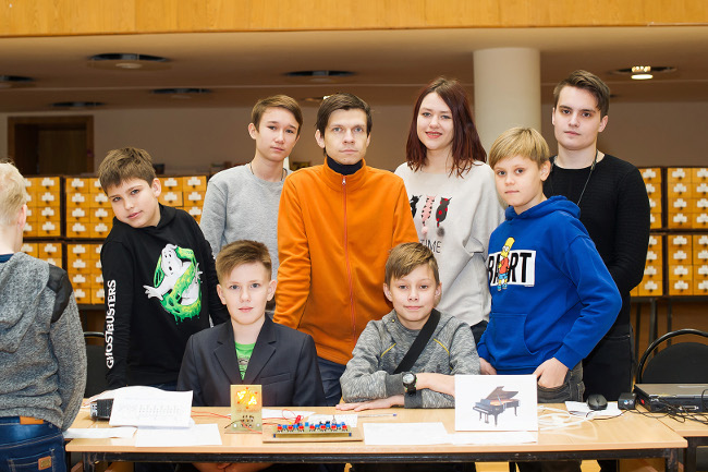 Так же стоит отметить ещё одну работу – это робот геометр. Константин собрал робота рисующего маркером простые геометрические фигуры. Учитывая, что на работу ушло больше месяца – это непростое техническое и программное решение. В выставке радио поделок королем соревнований оказались портативные игры ардуино-бой. Ребята из г.Волжский собрали три игры с возможностью их последующего перепрограммирования. Если честно, то ажиотаж у игр стоял такой, что мне не довелось сыграть, зато наши юные гости и жюри оценили эти работы по достоинству. Так же весь день было слышно электронное пианино разработки Максима и Дмитрия. Электронные звуки пищалок разнообразили людской гул.