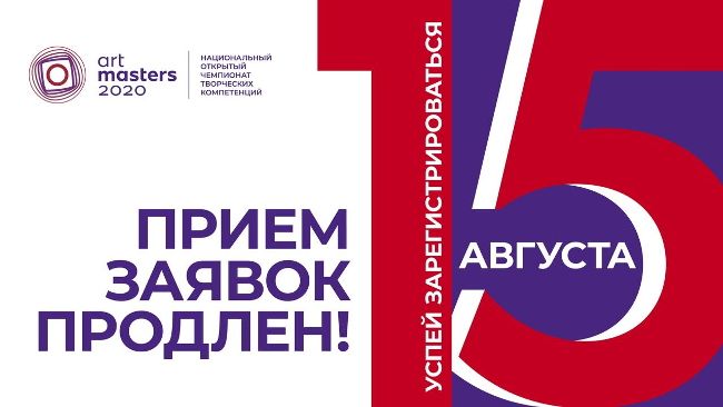 Первый национальный открытый чемпионат творческих компетенций ArtMasters объявляет о продлении сроков приема заявок на участие до 15 августа. Теперь еще больше талантливых молодых людей со всей России смогут присоединиться к соревнованию и получить шанс на стажировку и трудоустройство в ведущих медиакомпаниях, театрах и на киностудиях страны.