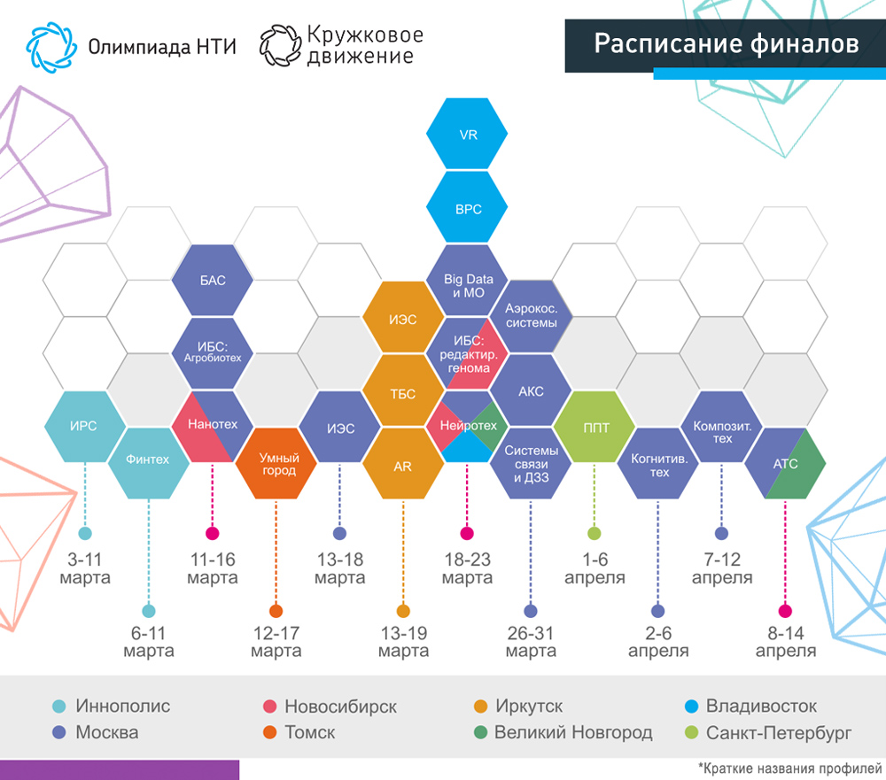 Учитывая широкую географию проживания участников, организаторы решили провести финалы по наиболее популярным профилям на разных площадках, чтобы как можно больше талантливых школьников смогли принять участие в финале. Заключительные этапы соревнований пройдут одновременно в разных городах с учетом часовых поясов, чтобы никто не получил преимущества. Финалистов Олимпиады НТИ примут площадки Великого Новгорода, Владивостока, Долгопрудного, Иннополиса, Иркутска, Королева, Москвы, Новосибирска, Санкт-Петербурга и Томска. Испытания пройдут в формате хакатонов: участники будут искать наилучшее решение технологической проблемы, например, оптимальный алгоритм обработки данных или технологию получения материала с заданными свойствами.
