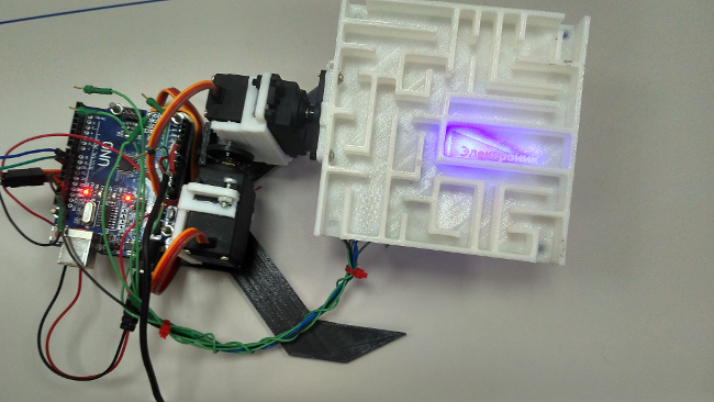 Наталья Сапрыкина, преподаватель ШР «Электроник»: Самый запомнившийся проект — модель под названием «Лабиринт», созданная по мотивам детской игры, где нужно было провести шарик по лабиринту. Наши ребята решили его роботизировать при помощи пары сервоприводов, джойстика и, конечно, ардуино. В качестве игрового поля сначала взяли детскую игрушку, потом напечатали его на 3D-принтере. Модель неожиданно нашла себе применение в области реабилитационной медицины — один знакомый, утративший чувствительность кисти после перелома, с ее помощью разрабатывал руку. Один раз, перед выставкой, ребята инвертировали движения лабиринта — джойстик идет влево, а лабиринт вправо, джойстик вверх- лабиринт вниз) Эту выставку мы запомнили.