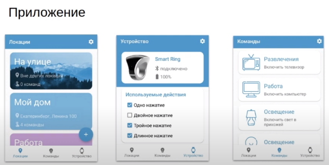 Например, студент Уральского Федерального Университета Владислав Шатерников разработал «умное кольцо» SmartRing для управления устройствами в доме. Кольцо работает как контроллер, и на его кнопку можно назначить любую функциональность. Владислав продумал вопрос интеграции кольца с существующими системами «умного дома», в частности, с развитой экосистемой Samsung SmartThings, что значительно повысило ее доступность для пользователя.