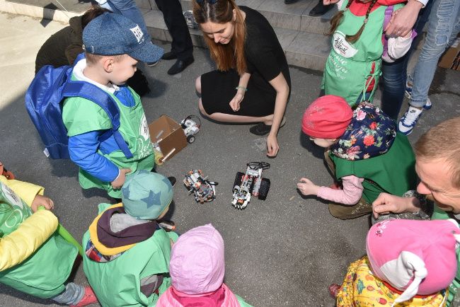 Перед началом субботника собравшиеся увидели показательные «выступления» маленьких роботов-уборщиков, в том числе радиоуправляемых.