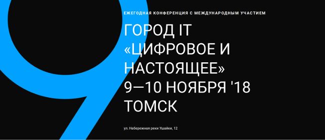 «Город IT» — крупнейшая за Уралом всероссийская конференция, посвященная проблемам и трендам на рынке информационных технологий. «Город IT» проходит ежегодно с 2010 года, в этом году конференция состоится в девятый раз, ее тема — «Цифровое будущее». Событие соберет спикеров со всей России, объединит секции для профессиональных разработчиков, а также специалистов и сферы бизнеса и маркетинга. В этом году организаторами конференции выступили Администрация Томской области, компании Lab365 SibEDGE, Aurigma, USERSTORY, а также центр кластерного развития «Синергия».