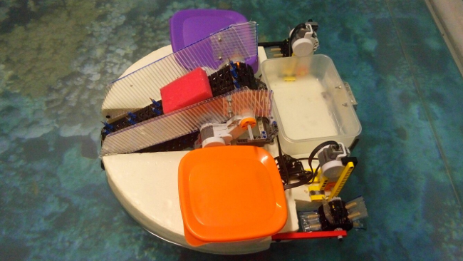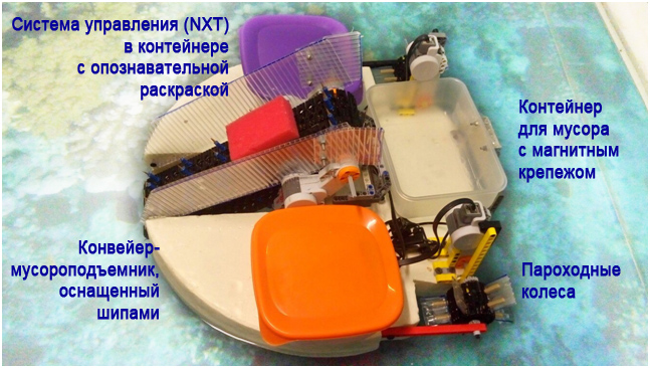 - Программа на контроллере NXT управляет движением робота-сборщика по воде и подъемом найденного мусора.