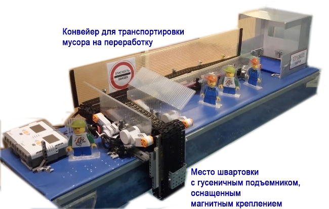 Робот-сборщик мусора, автоматизированный подъемник и конвейер собраны из конструктора Lego Mindstorms NXT с применением дополнительных материалов.