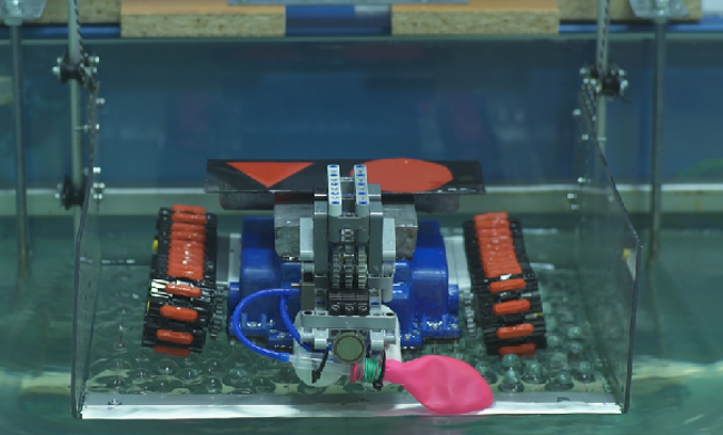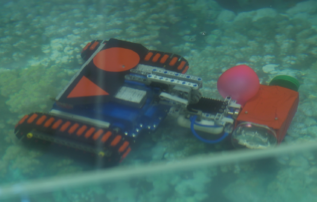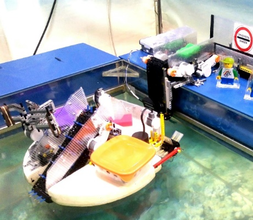 На фотографии подводный робот подходит к месту нахождения опасного объекта и присоединяет к нему с помощью магнита надувающийся понтон. Для надува понтона использована пневматика Лего.