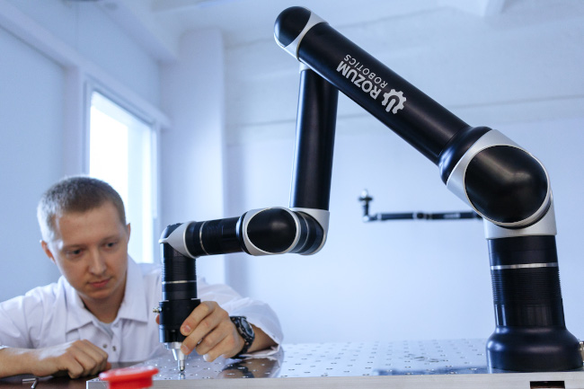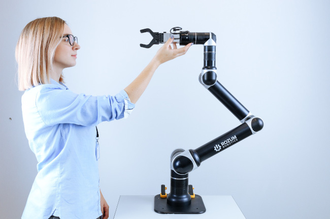 Во-первых, за счет компактного размера и веса коботов можно просто и быстро передвигать от конвейера к конвейеру, перемещать между цехами, устанавливать в одной рабочей зоне с сотрудниками-людьми. Во-вторых, кобота легко перепрограммировать под новые задачи. При разработке коботов компании стараются сделать его управление интуитивно понятным. Например, обучать кобота в RozumLab можно даже в ручном режиме – его надо просто провести по точкам, кобот запомнит траекторию и повторит движения с точностью в 0,1 мм. Основное ограничение – грузоподъемность. В отличие от промышленных манипуляторов, большинство коботов могут работать с объектами весом до 10 кг.