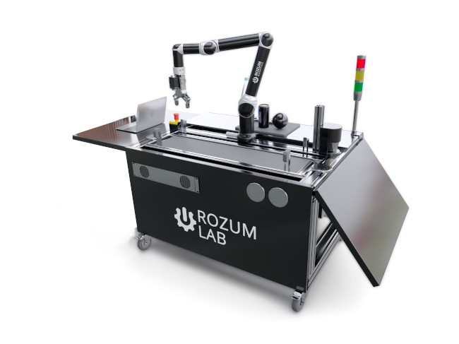 RozumLab – это учебная ячейка на базе робота-манипулятора. Она предназначена для практического и теоретического обучения системам автоматизации. Визуально ячейка представляет собой мобильную тележку с установленным на ней роботом-манипулятором, конвейерной лентой, системой датчиков и кнопок, световой колонной, ноутбуком. Внутри тележки размещены контролбокс робота и отсеки для хранения сменных захватных устройств.