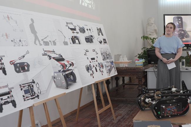 Но особенное внимание привлекла работа студентки Алены Богданович «Разработка дизайн-проекта сервисного робота Амур-307», выполненная совместно с МГТУ «Станкин», партнером Политехнического университета, с которым в конце прошлого года было подписано соглашение о сотрудничестве в части образовательной и научной работы, совместного участия в грантах и конкурсах. Научными руководителями Алены были доцент кафедры «Инженерная графика и дизайн», кандидат наук А.Г. Зубов и заведующий кафедрой «Сенсорные и управляющие системы» МГТУ «Станкин», доктор технических наук В.Е. Пряничников. Задача представленного робота – образовательная. Именно на него возлагаются надежды на решение проблем, связанных с низким уровнем внедрения основ робототехники в современную систему образования из-за недостаточного оснащения вузов и школ наборами для практических занятий по робототехнике. В отличие от роботов, создаваемых школьниками и студентами в специализированных кружках, представленная модель будет более доступной для применения и обучения во всех регионах страны. Ее можно легко разобрать и собрать, а сломанные детали быстро и дешево заменить. Эти преимущества и легли в основу концепции робота. За инженерную и конструкторскую составляющую отвечал МГТУ «Станкин». Задачей Политеха была разработка функционального, удобного, безопасного и компактного дизайна, позволяющего роботу быть максимально применимым в образовательном процессе и легко выполнять задаваемые задачи.