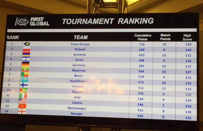 Казахстан представила сборная команда Назарбаев Интеллектуальных школ города Алматы: Никита Носков, Данияр Акижанов, Олжас Базарбеков, Алижан Кисамиден, Данияр Турганбаев, Данил Прохоренко и единственная девушка в великолепной семерке Даниса Сандыкбаева. Сегодня элективные курсы по робототехнике работают во всех Интеллектуальных школах страны.