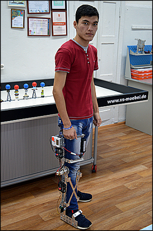Ученик красноярской станции юных техников Солибой Эргашев стал автором проекта «Роботизированный каркас». Собранный из металлического конструктора робот надевается на парализованную ногу, при помощи нескольких маленьких двигателей он полностью повторяет движение ноги.