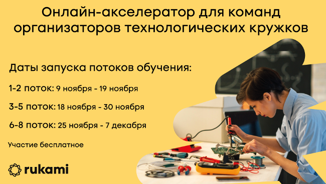Первый набор онлайн-акселератора Rukami для организаторов технологических кружков состоялся в мае-июне этого года. Его участниками стали более 500 человек.
